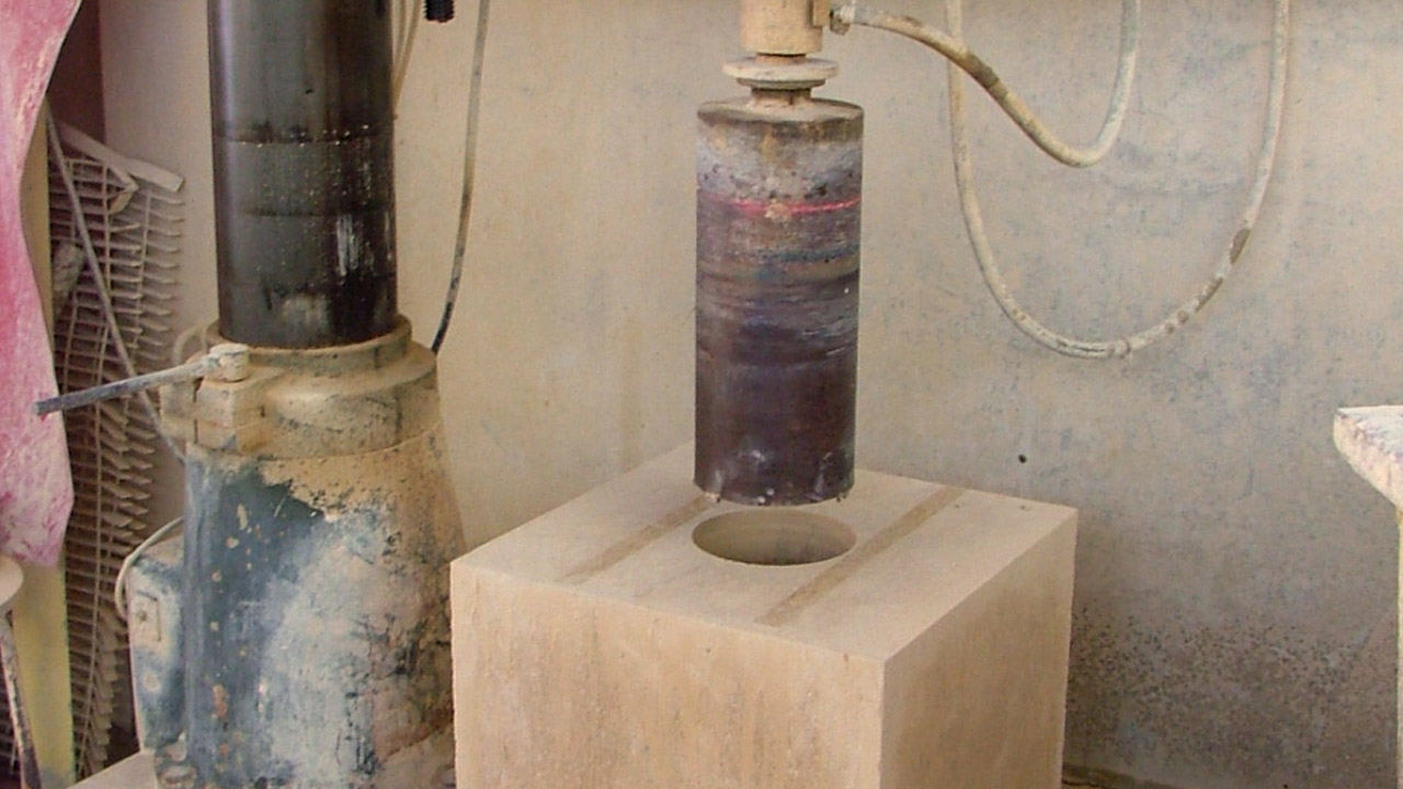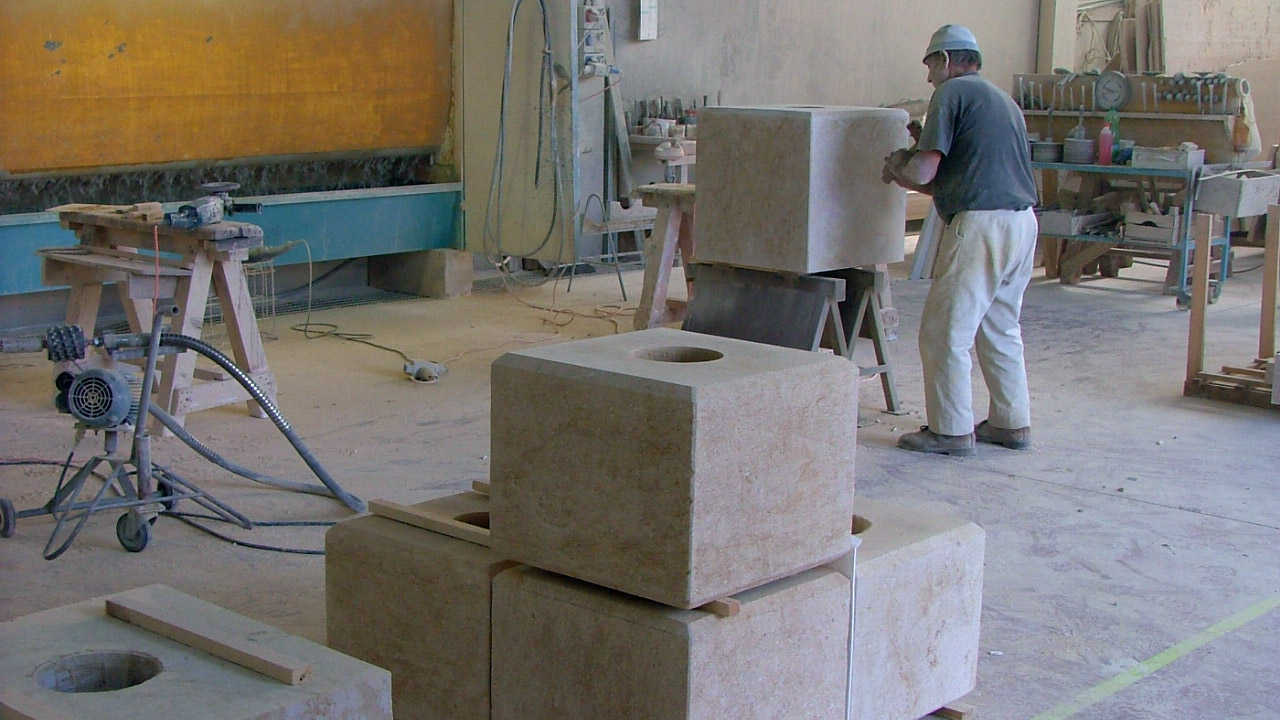 Fasi di lavotrzione di pilastri per cancello in pietra gialla di Vicenza (tufo giallo),a conci forati.